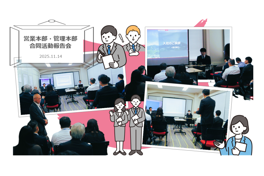 当社では毎年、各部門が自らテーマを掲げ、取り組んできた活動を全社に共有する「活動報告会」が開催されています。今回は、2025年11月14日、本社にて開催された、営業本部と管理本部の活動報告会の様子をダイジェストでお届けします。