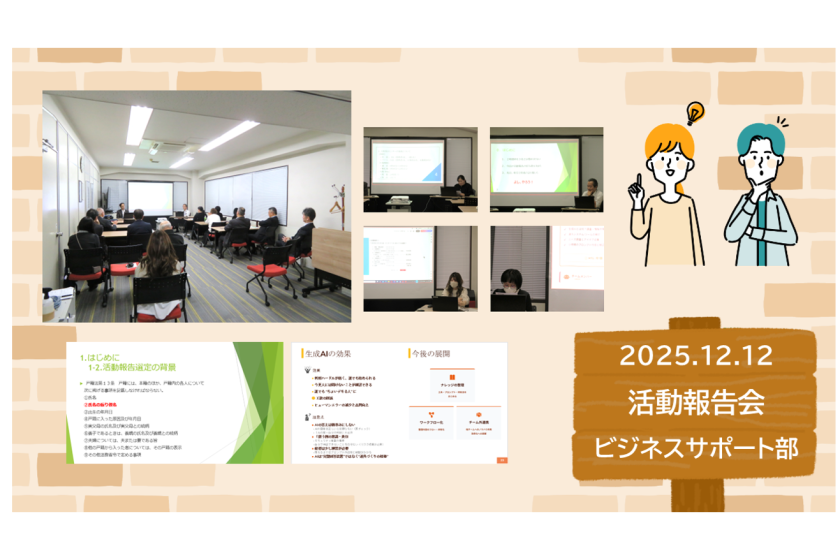 2025年12月12日、ビジネスサポート部の部門活動報告会が開催され、以下4件の報告が行われました。