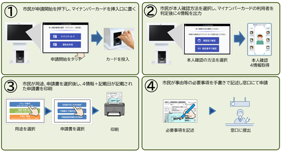 以上の4工程でマイナンバーカードの氏名・住所などの個人情報があらかじめ印字された申請書を作成することができます。